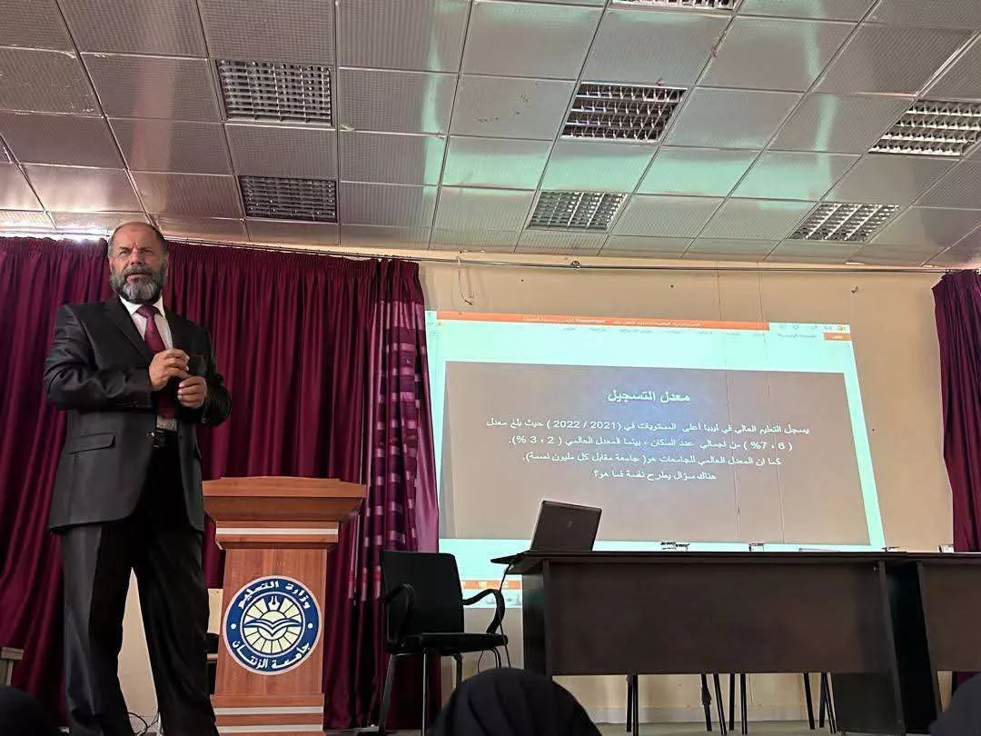 قدّم الورشة الدكتور المبروك السايق، وتناول خلالها أبرز محاور الخطة الوطنية، من حيث واقع التعليم العالي في ليبيا، والطموحات المستقبلية لتطويره، بالإضافة إلى أهم التحديات التي تواجه تنفيذ هذه الخطة وآليات التغلب عليها.